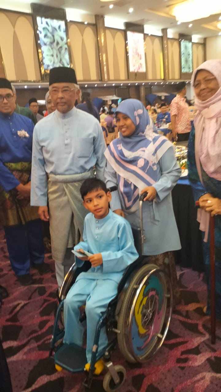 Lantas baginda bertemu dan bersalam dengan adik Amir Sabri, 11 tahun, yang ditemani ibunya Fadilah. Kanak-kanak itu kelihatan sungguh ceria kerana disapa oleh tuanku yang kemudian bergambar kenangan.