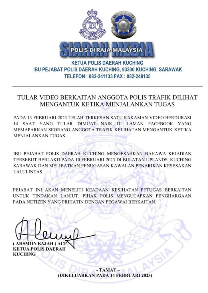 Polis Diraja Malaysia Daerah Kuching telah mengambil maklum tentang insiden berkenaan yang dipercayai berlaku di Bulatan Uplands, Kuching, Sarawak pada Jumaat, 17 Februari 2023 lalu.