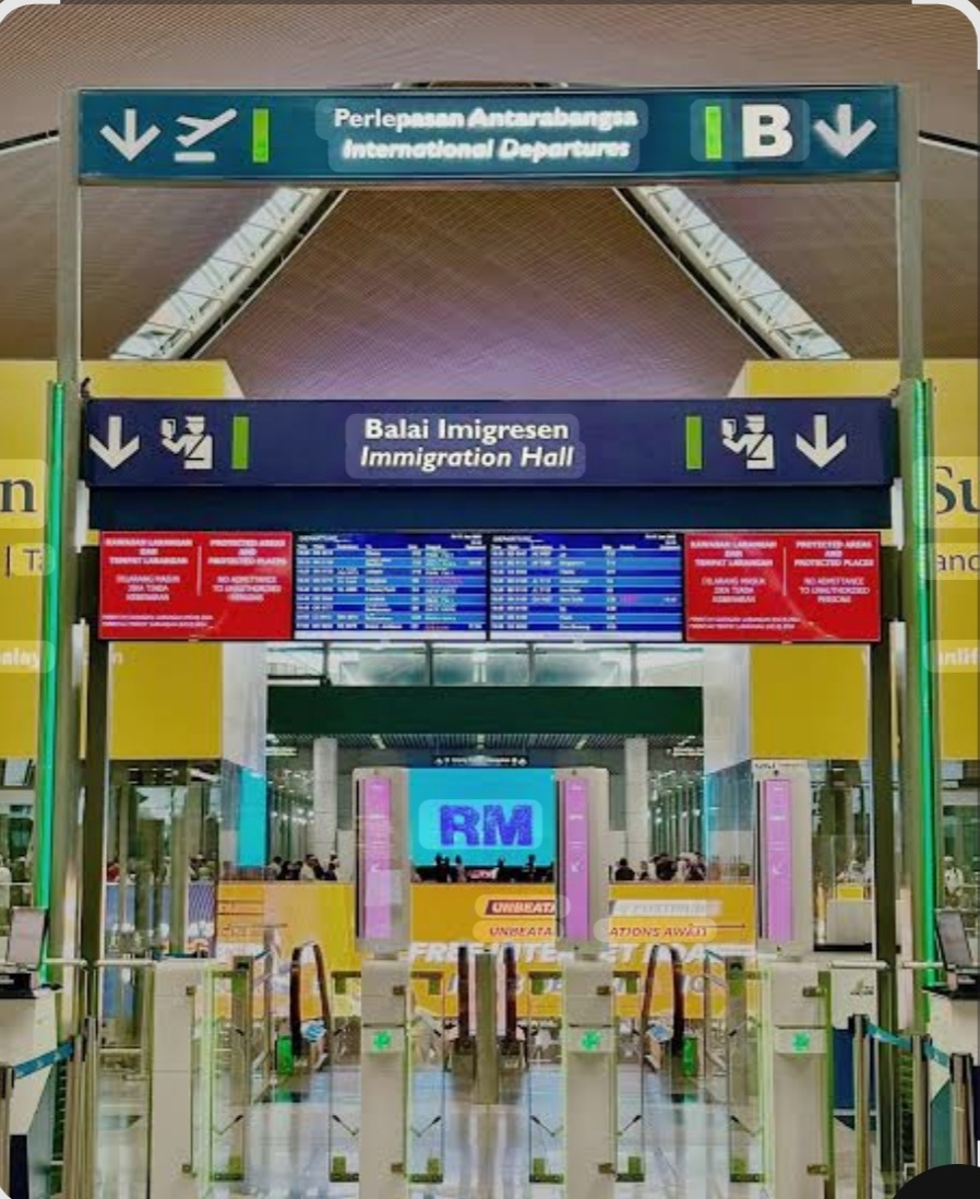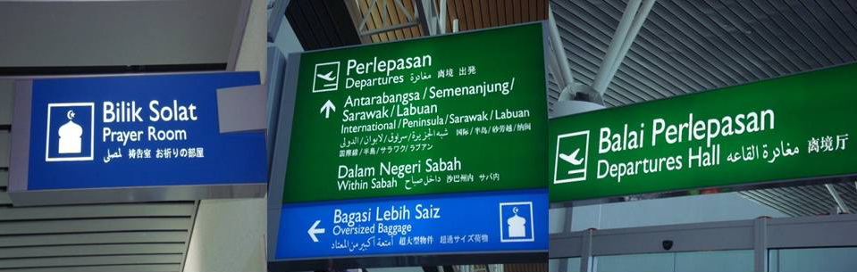 Di Lapangan Terbang Kuala Lumpur (KLIA) papan tanda dalam bahasa Melayu turut diiringi bahasa Inggeris sebagai panduan kepada pelancong luar.
