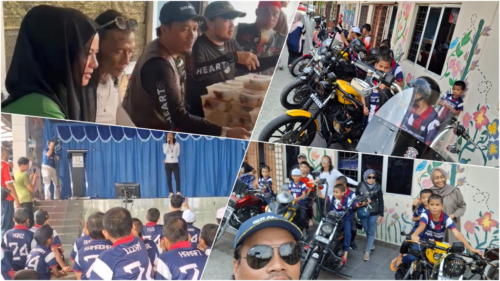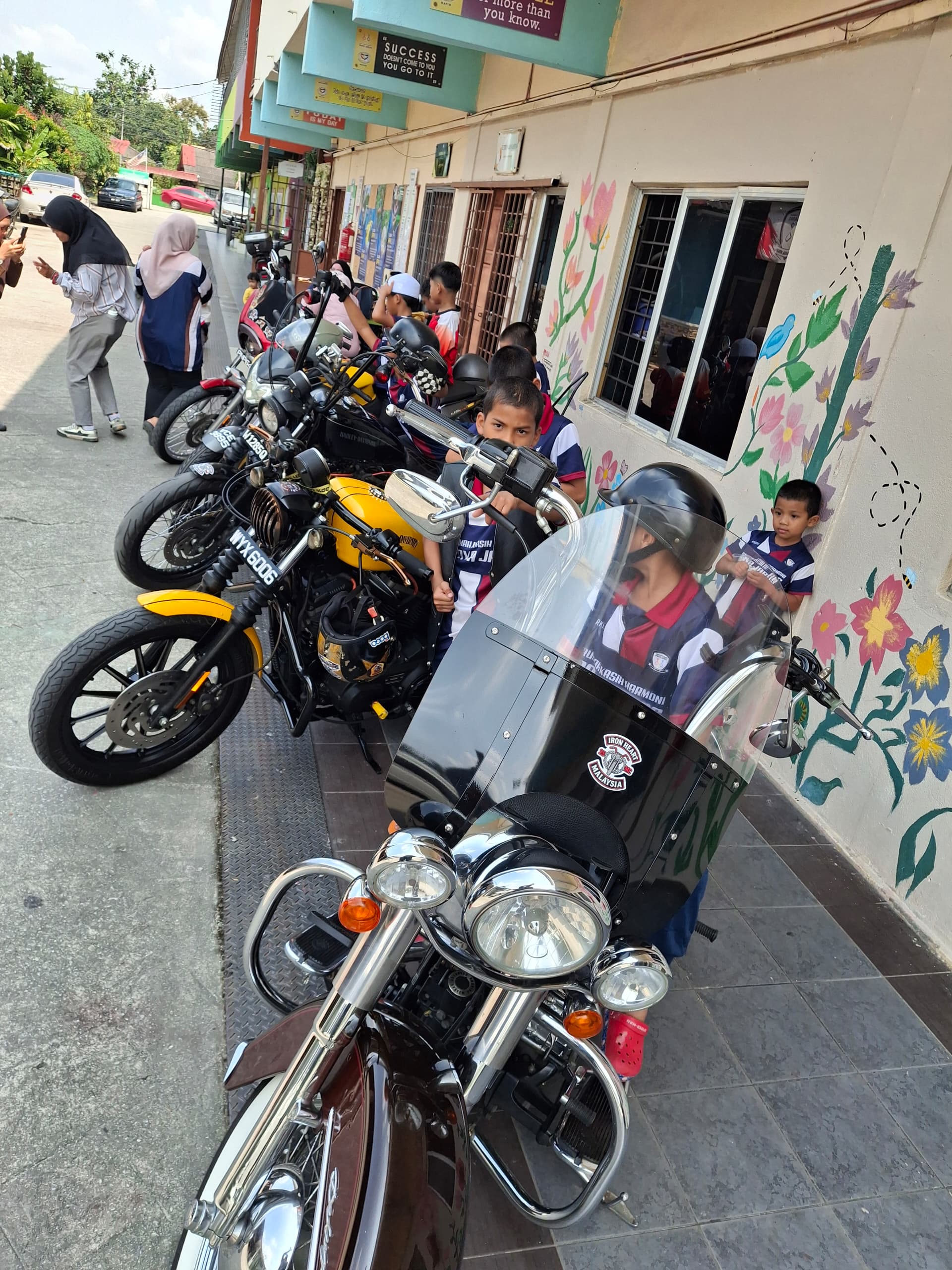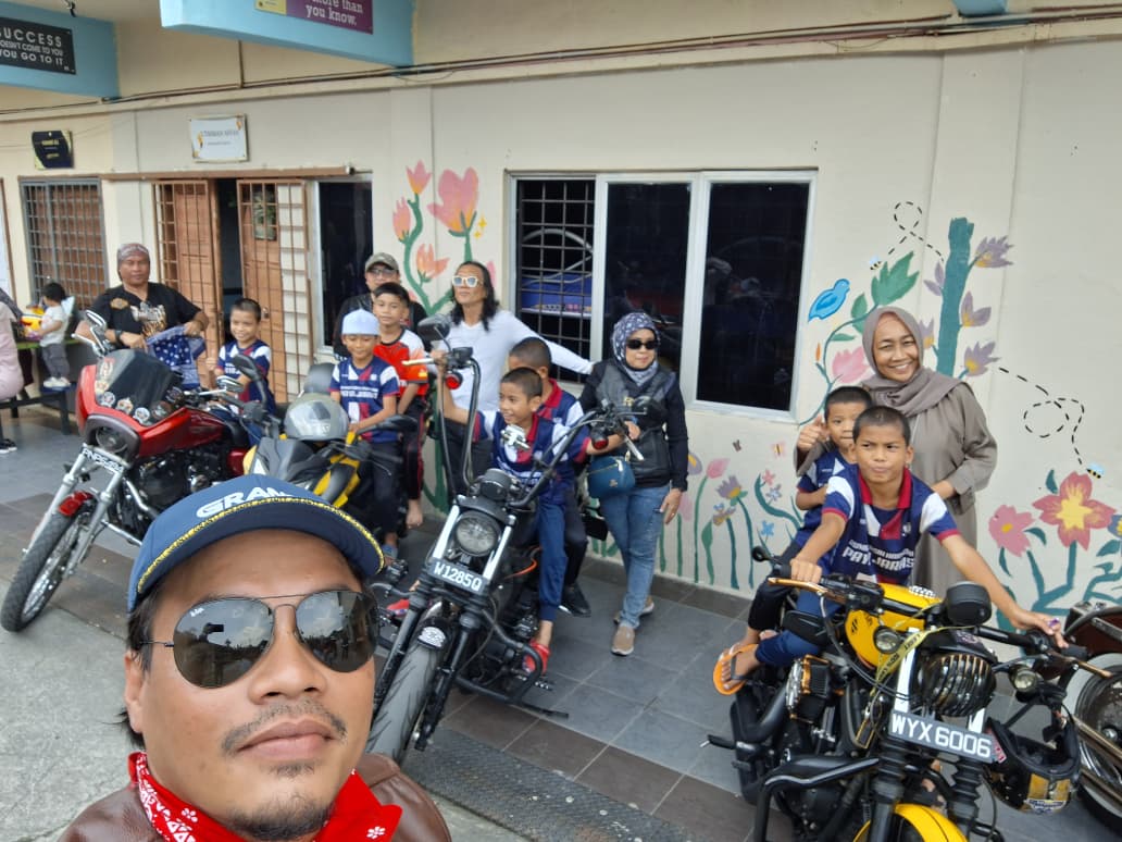 Mikail School Band, Yantzen dan Anita berswafoto bersama anak yatim diberi peluang menaiki motosikal berkuasa tinggi.