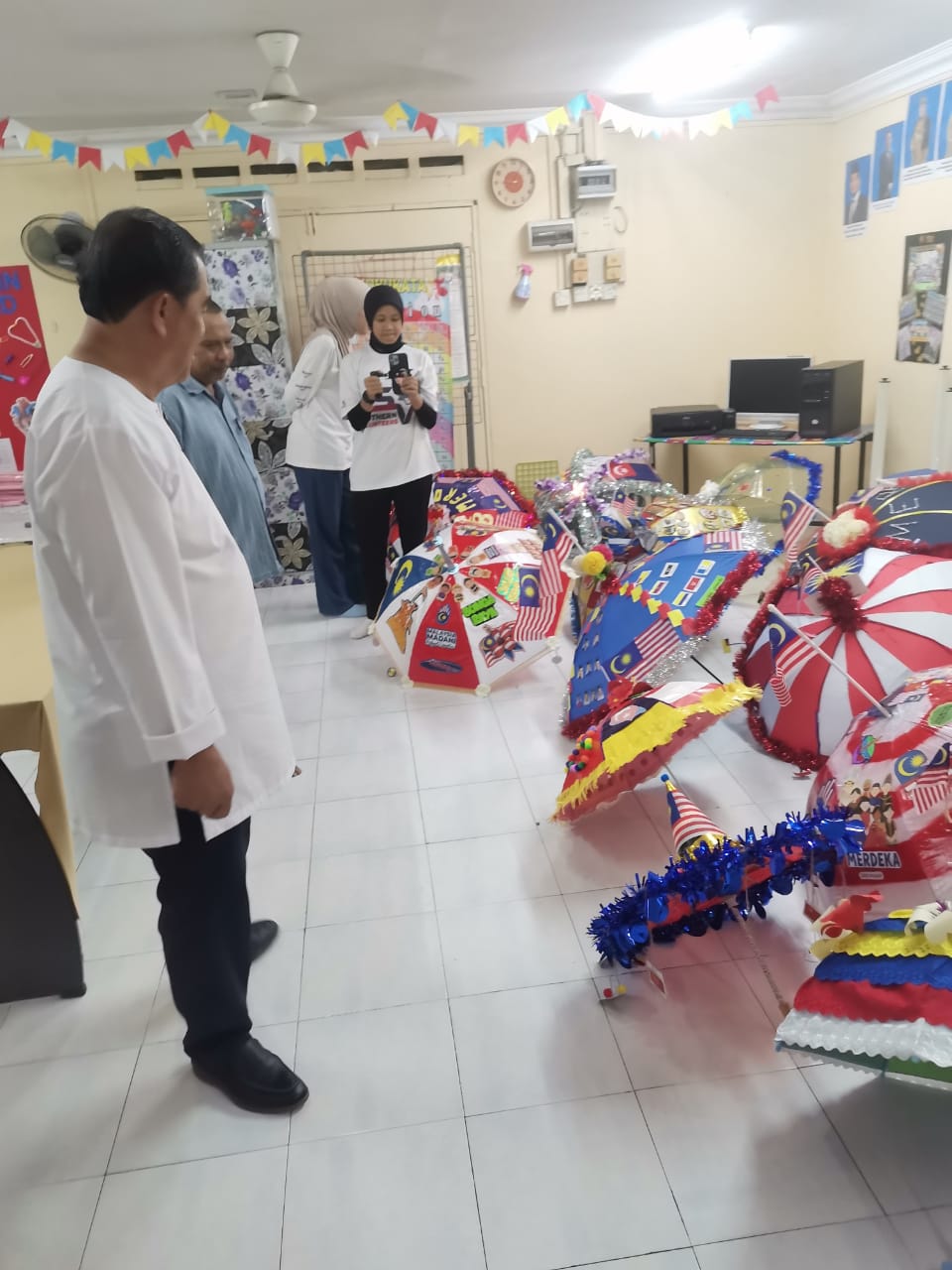 Hiasan kraf payung berdasarkan konsep Jalur Gemilang hasil kerja tangan penduduk menarik perhatian Baharudin.