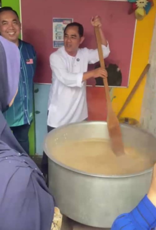 Roszaidi menyantuni Baharudin yang turut mengacau bubuk lambuk.
