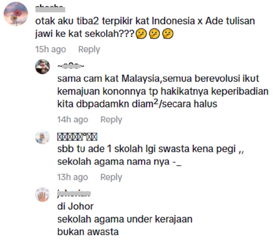 “Otak aku tiba-tiba terfikir kat Indonesia tiada tulisan jawi ke kat sekolah?” soalnya.