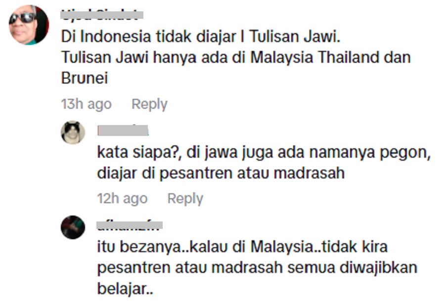 Manakala dari sudut pandang netizen Indonesia, ada yang menjelaskan bahawa tulisan jawi tidak diajar secara meluas di sekolah arus perdana.