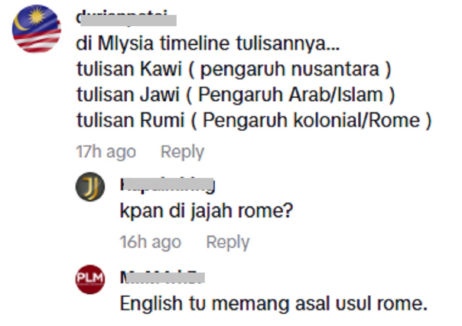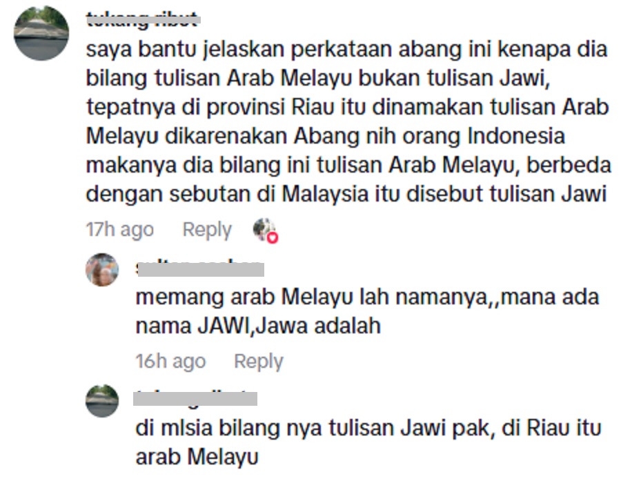 “Di Indonesia itu namanya tulisan Arab Melayu tepatnya di daerah Riau masih digunakan tulisan seperti itu. Di Malaysia namanya itu tulisan Jawi. Abang itu (merujuk kepada pemilik video) menyebut istilah yang diguna pakai di Indonesia,” jelasnya.