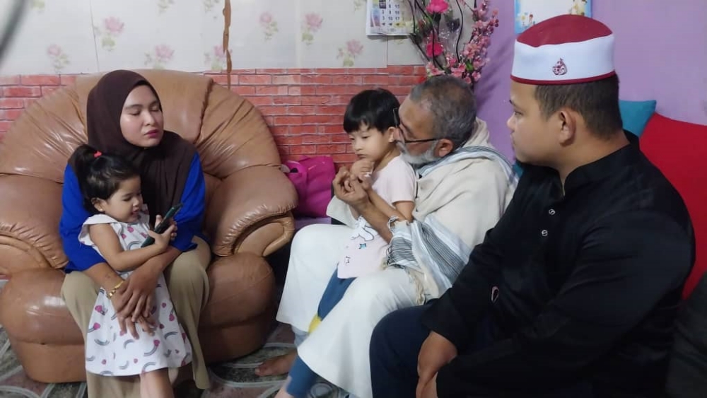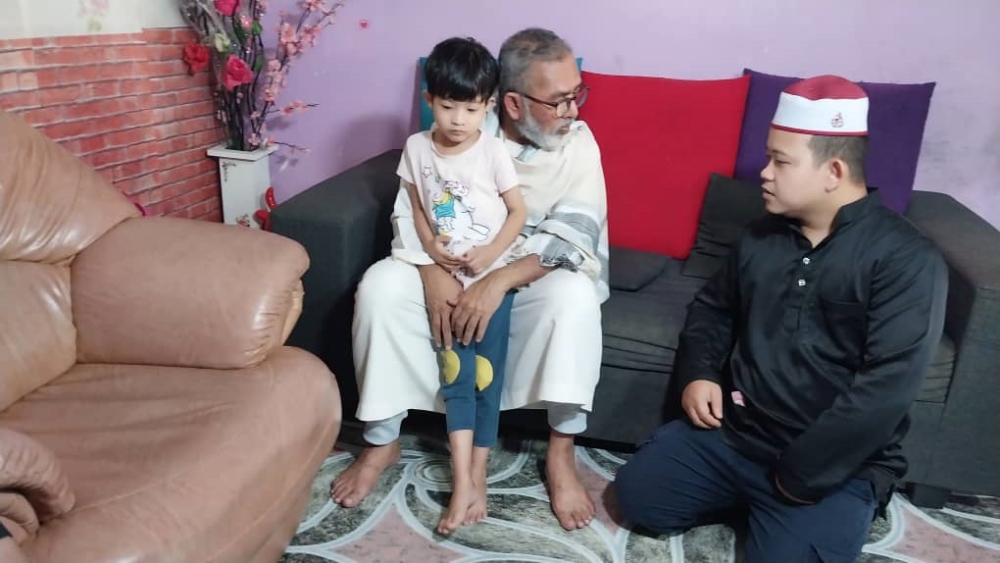 Syed Abu Hussin Hafiz Syed Abdul Fasal (tengah) sedang memangku Nur Faqeeha Ufiyya Muhammad Firdaus sambil diperhatikan oleh Rohaszila Yahaya (kiri) dan Muhammad Firdaus Mohd Saad (kanan) ketika melawat keluarga itu di Kampung Kurnia Jaya Sambungan di Kamunting, Taiping.