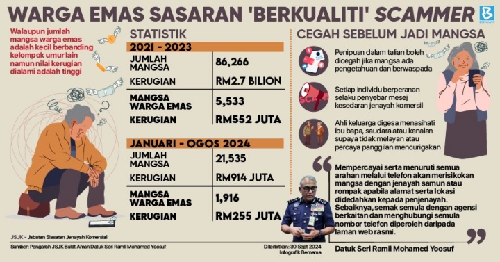 Dalam kaitan yang sama hari ini, makin kerap kita dengar cerita orang tua atau warga emas jadi mangsa scammer. Duit simpanan yang mereka kumpul bertahun-tahun habis lesap sekelip mata.