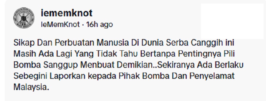 Perkongsian seorang lelaki dipercayai anggota Jabatan Bomba dan Penyelamat Malaysia (JBPM) tentang sikap segelintir masyarakat yang tidak peka dan sensitif mengenai kepentingan pili bomba.