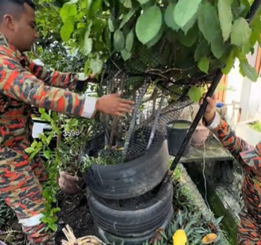 Dalam video yang dikongsi, kelihatan beberapa orang anggota bomba sedang membongkar pasu yang diperbuat daripada tayar di hadapan sebuah rumah di kawasan taman perumahan.