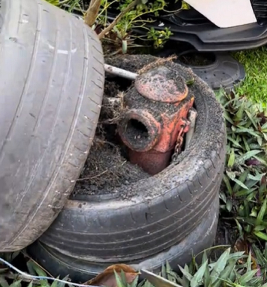 Apa yang mengejutkan, rupa-rupanya dalam pasu tayar tersebut tersembunyi pili bomba. Bayangkan kalau ada kebakaran, tidakkah ia menyukarkan kerja-kerja menyelamat oleh pihak bomba?