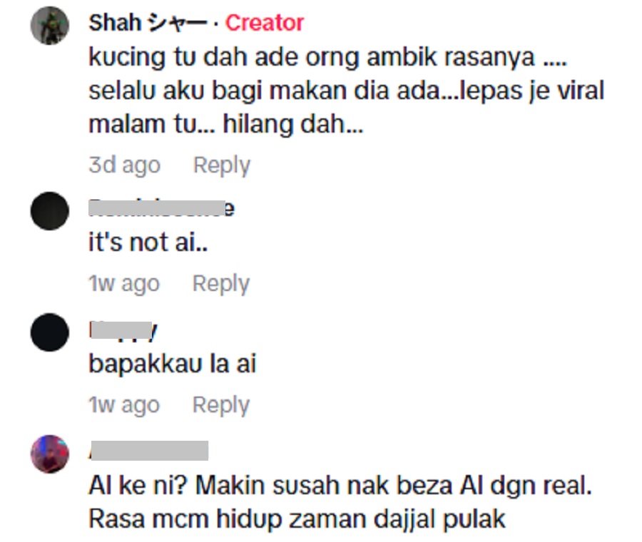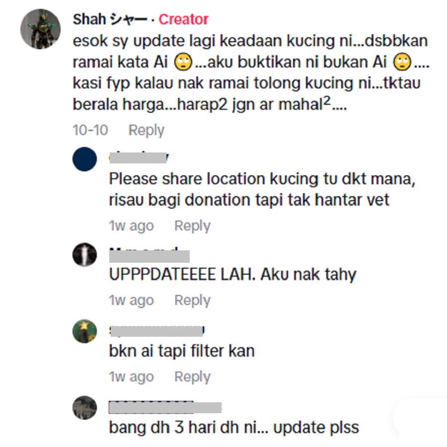 “Ramai kata AI. Aku buktikan ni bukan AI. Kasi FYP kalau nak ramai tolong kucing ni,” tulisnya.