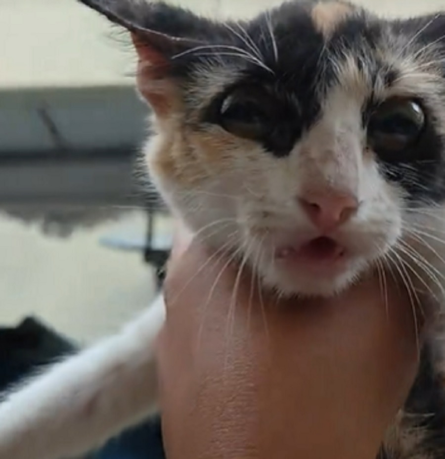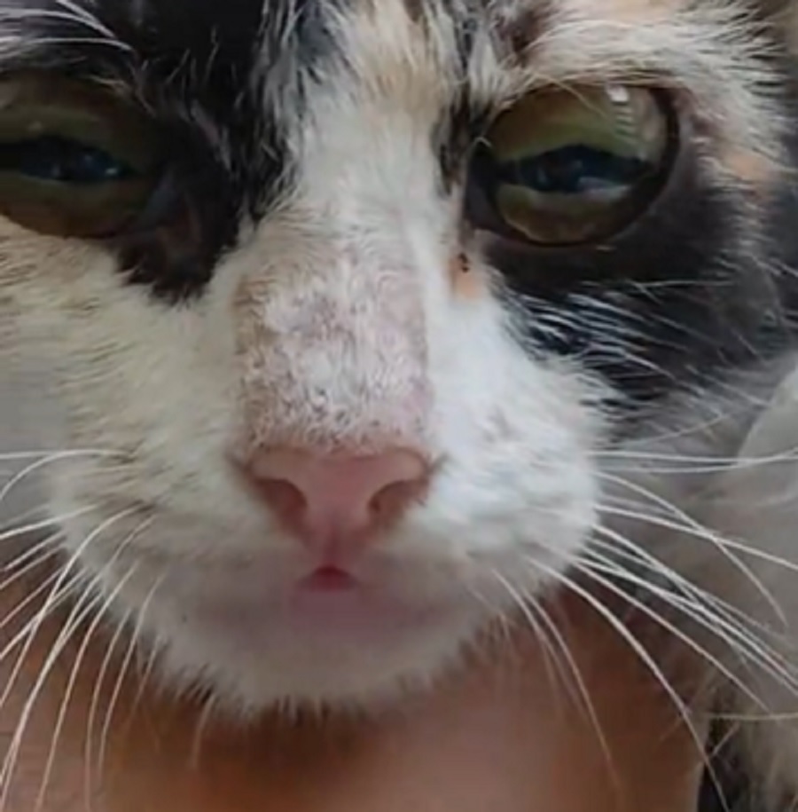 Rakaman berdurasi beberapa saat itu menunjukkan seekor kucing berwarna putih bertompok hitam dan oren kelihatan tenang sambil memandang ke arah kamera.