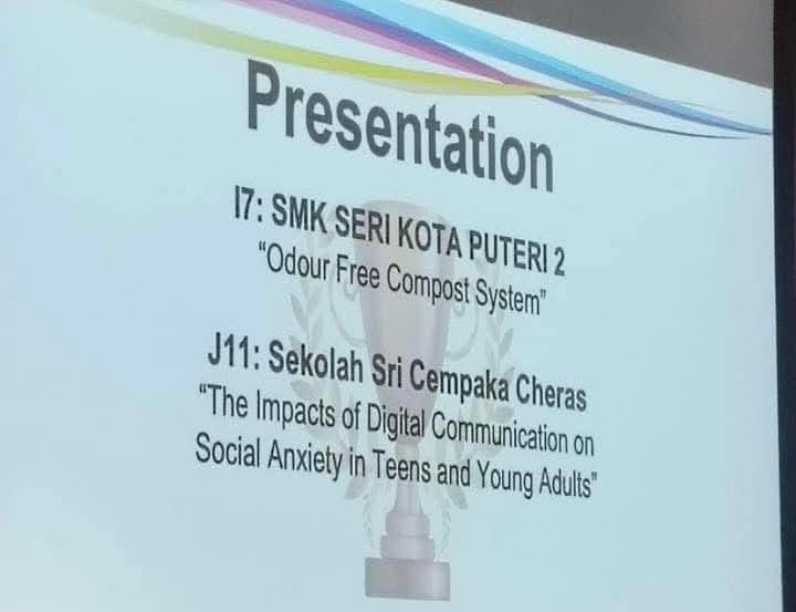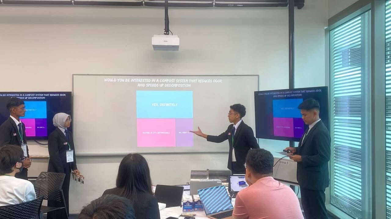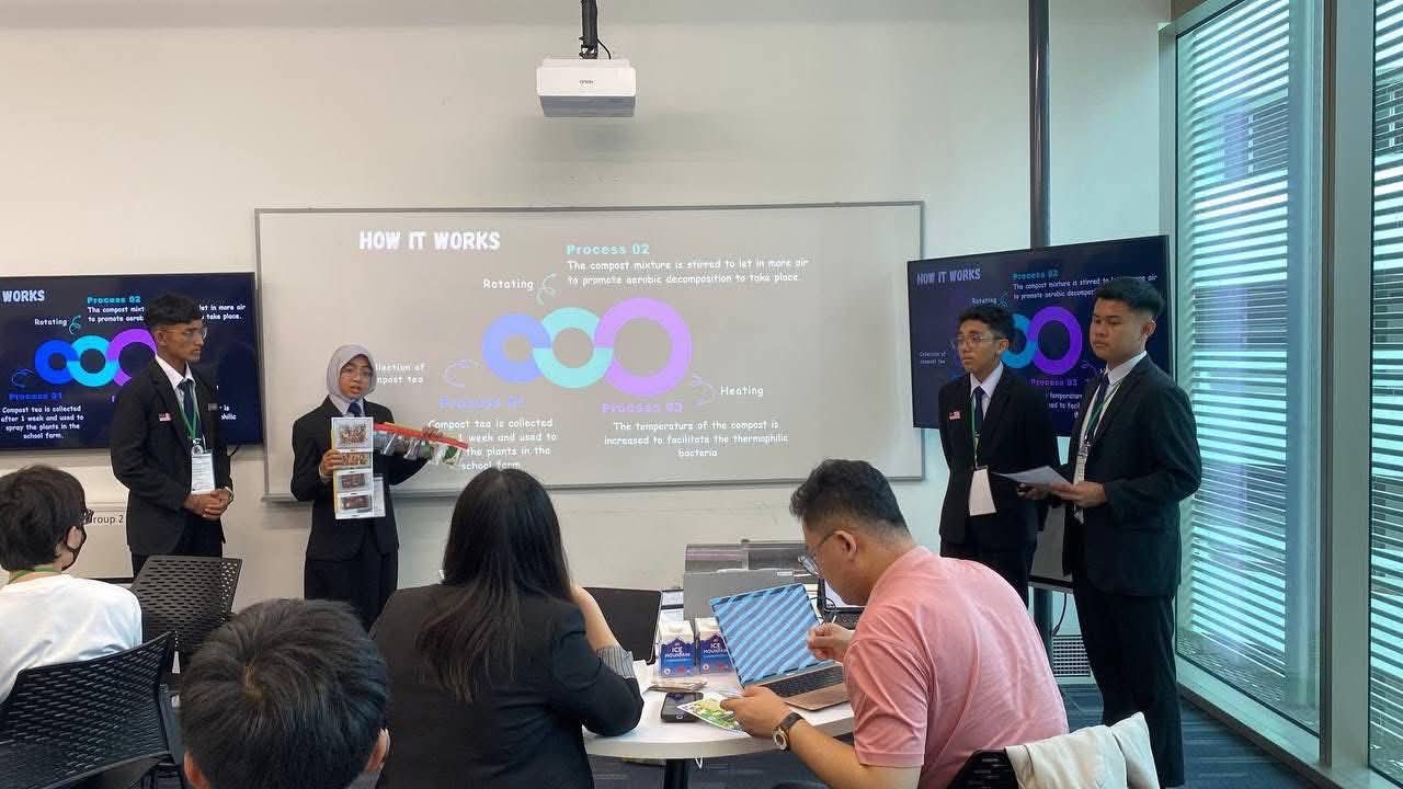 Pelajar SMK Seri Kota Puteri 2, Masai memulakan sesi pembentangan projek “Odour Free Compost System” di hadapan juri antarabangsa.