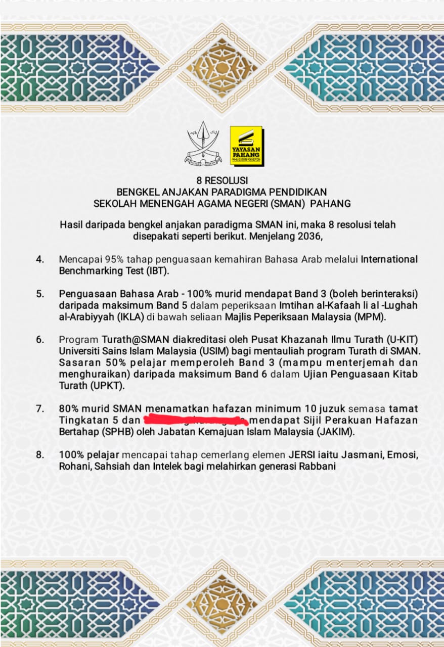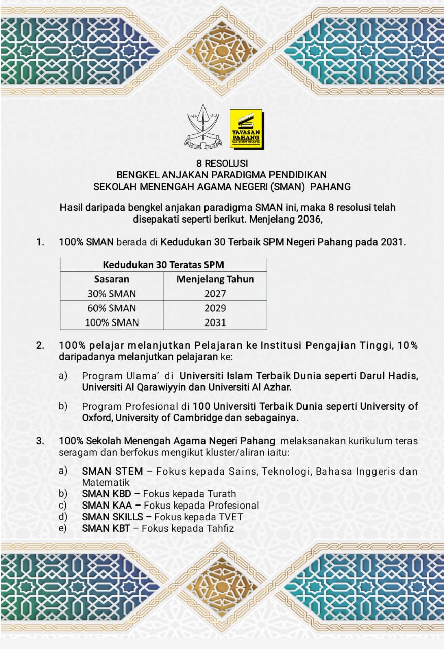 Antara resolusi utama yang dirumuskan ialah sasaran memastikan 100 peratus SMAN berada dalam kelompok 30 terbaik keputusan Sijil Pelajaran Malaysia (SPM) Negeri Pahang menjelang tahun 2031.