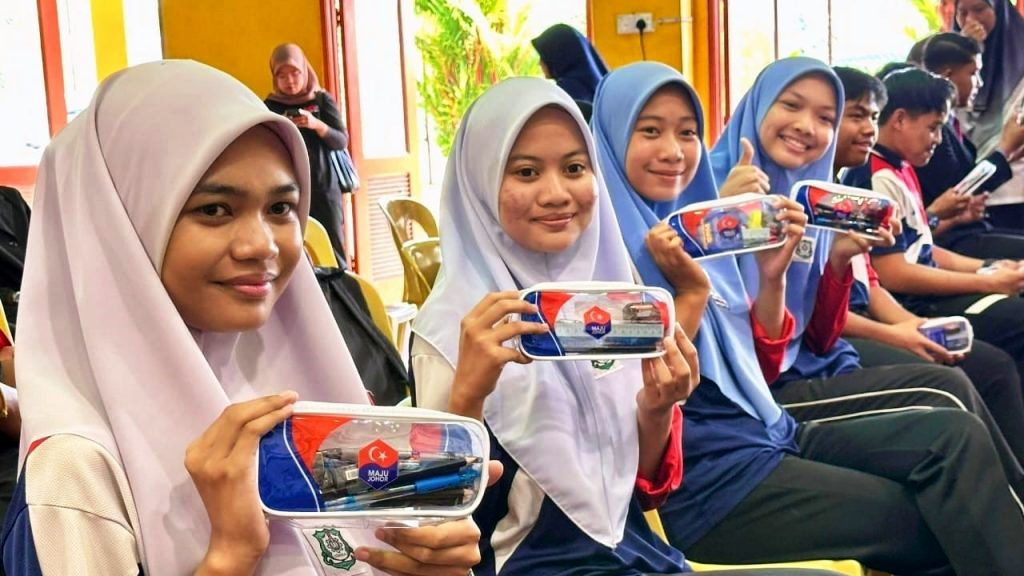 Beberapa calon SPM 2025 SMK Adela, Kota Tinggi, Johor menunjukkan Kit SPM Maju Johor yang mengandungi alat tulis untuk kegunaan ketika ujiaan bertulis SPM.-Kredit foto: Facebook Aznan Tamin.