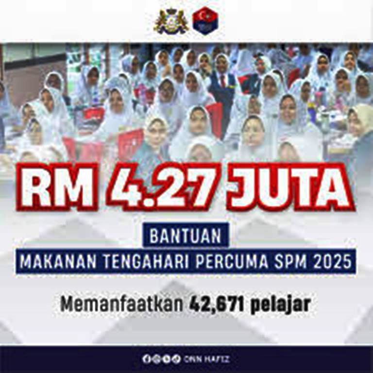 Tiada yang terkecuali, semua calon SPM 2025 di negeri Johor mendapat manfaat bantuan makanan tengah hari percuma sepanjang ujian bertulis SPM selama 10 hari bermula 3 November 2025.