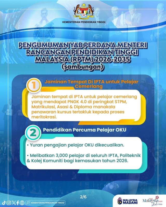 Pengumuman pendidikan percuma kepada pelajar Orang Kurang Upaya (OKU) dalam Pelan Pendidikan Tinggi Malaysia (PPTM) 2026–2035 wajar disambut sebagai satu langkah berani dan berprinsip.
