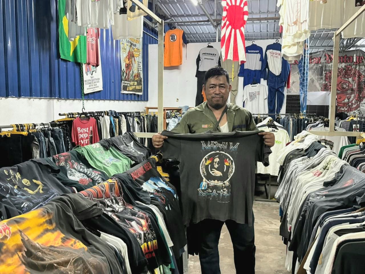 Mawardy Arshad atau Wadi menunjukkan sehelai kemeja-t vintaj kumpulan Napalm Death di kedainya di Pekan Lama Sungai Kob, Kulim, Kedah.