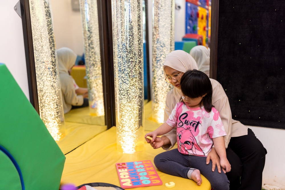 Adik Naura menjalani terapi yang dijalankan oleh Azimah Norsham, ahli terapi di Bilik Terapi Sensori Ronald McDonald, Tampin.