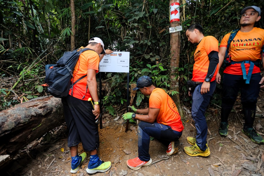 Sukarelawan Yayasan MR DIY bersama papan tanda baharu yang dipasang di laluan pendakian Bukit Kutu, Kuala Kubu Bharu, Selangor.