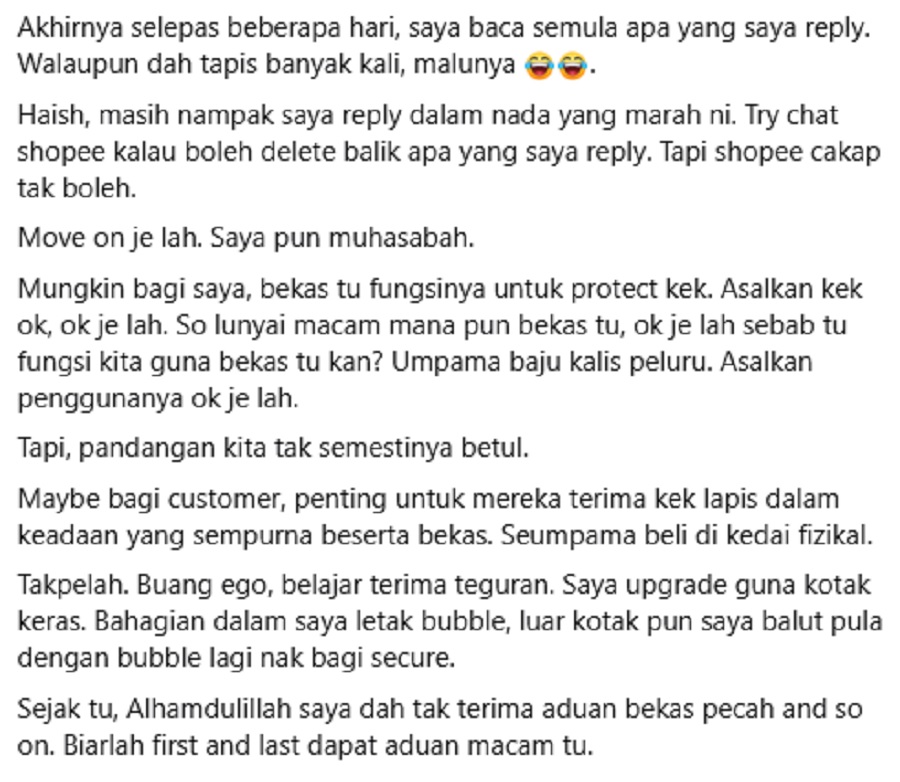 "Muhasabah dan terimalah teguran. Perbaiki mana yang boleh, bukan sekadar defend bisnes kita. Sesungguhnya ramai menilai adab kita menjawab dengan pelanggan,” luahnya yang merupakan peniaga kek lapis Sarawak.