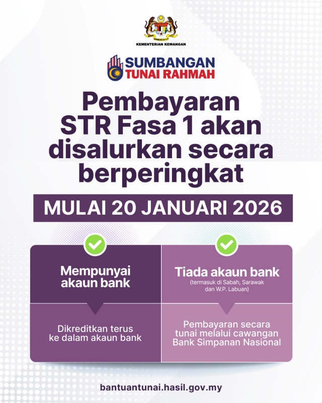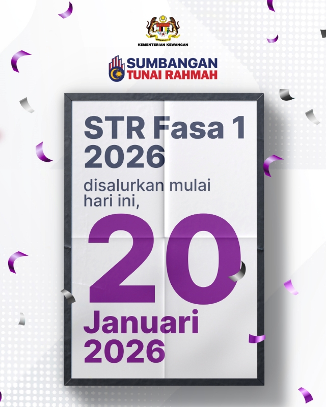 Berita baik buat 5 juta rakyat Malaysia. Semua penerima Sumbangan Tunai Rahmah (STR) akan menerima bayaran STR Fasa mulai 20 Januari 2026.