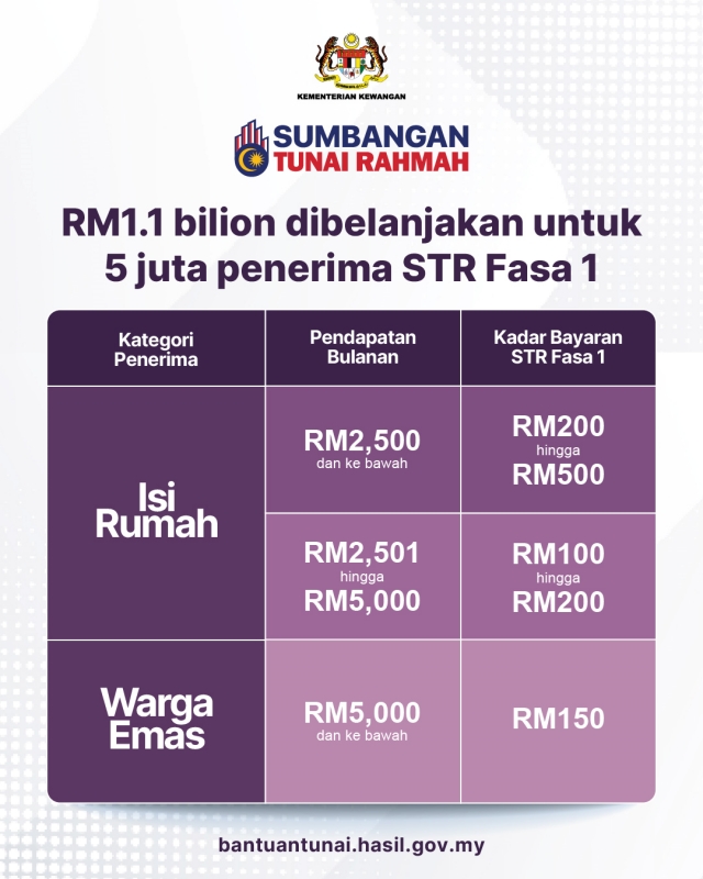 Bayaran STR bakal diterima adalah antara RM100 hingga RM500 bergantung kepada pendapatan bulanan isi rumah, manakala warga emas yang berpendapatan di bawah RM5,000 akan menerima RM150 setiap bulan.