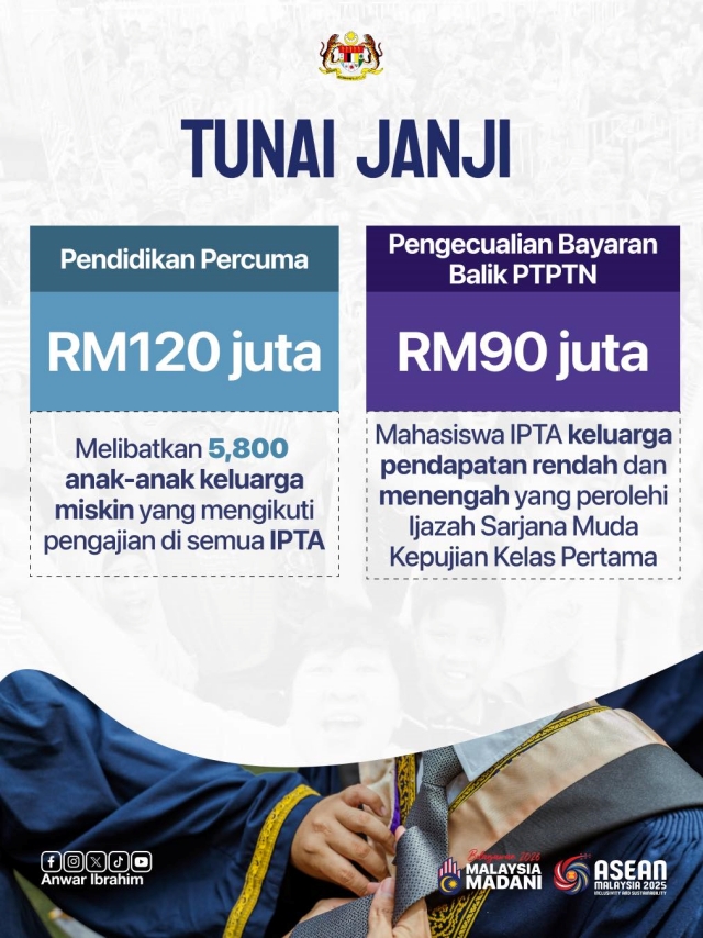 Belanjawan ini cukup bermakna kepada Perdana Menteri kerana hasratnya yang tertangguh sekian lama yakni pemansuhan bayaran balik PTPTN untuk keluarga berpendapatan rendah dan sederhana serta dan pendidikan percuma di IPTA bagi keluarga miskin -- janji yang dilafazkan oleh Datuk Seri Anwar Ibrahim lebih 13 tahun lalu -- dapat ditunaikan