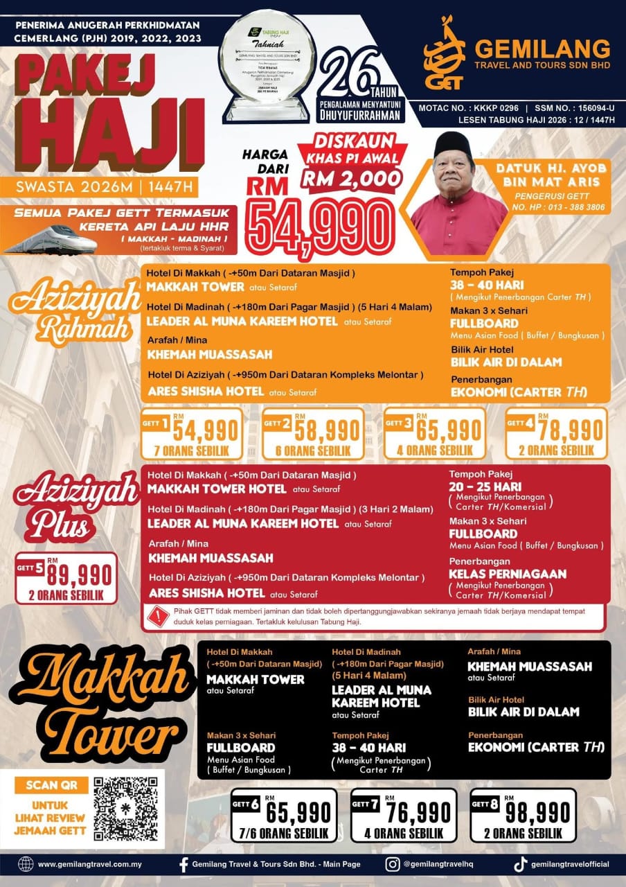 Gemilang Travel & Tours Sdn. Bhd. (GETT) kembali menawarkan Pakej Haji Swasta bagi musim haji 1447H/2026M dengan harga bermula serendah RM54,990 sebagai pilihan terbaik kepada umat Islam yang ingin menunaikan ibadah haji dengan selesa dan bimbingan lengkap.