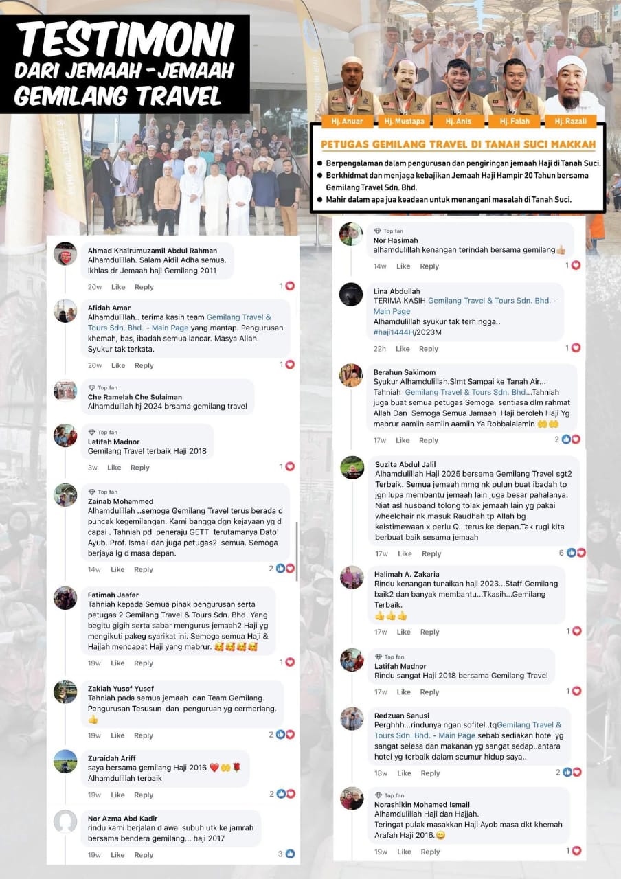 Rata-rata jemaah yang pernah menunaikan haji bersama Gemilang Travel menyatakan rasa puas hati terhadap pengurusan, bimbingan dan layanan yang diberikan.