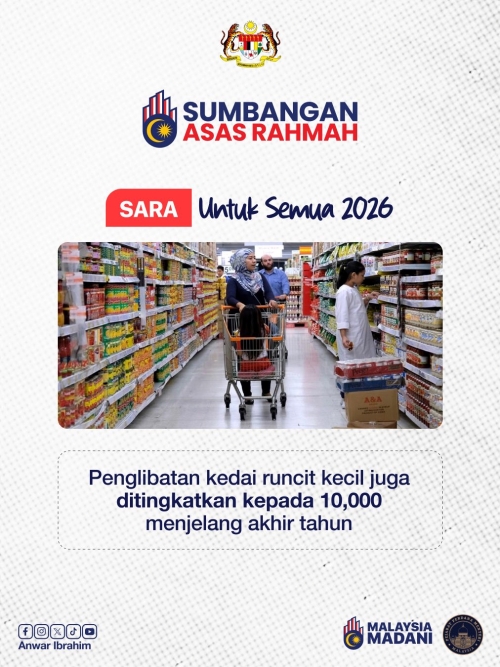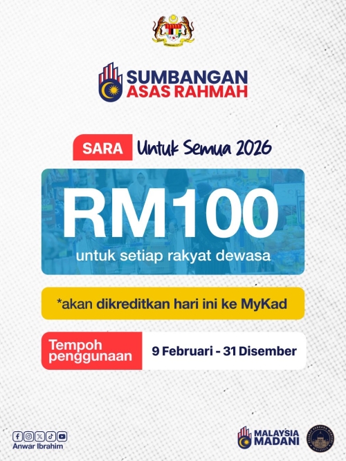 Seperti diumumkan oleh Dato’ Seri Anwar Ibrahim, Perdana Menteri dan Menteri Kewangan, Kerajaan Madani menyalurkan RM100 secara 'one-off' di bawah inisiatif Sumbangan Asas Rahmah (SARA) Untuk Semua kepada 22 juta rakyat Malaysia berusia 18 tahun dan ke atas dengan peruntukan RM2.2 bilion.