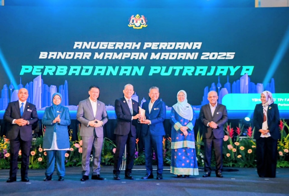 Presiden Perbadanan Putrajaya, Datuk TPr Fadlun Mak Ujud menerima plak Anugerah Perdana Bandar Mampan Madani 2025 daripada Fadillah Yusof.