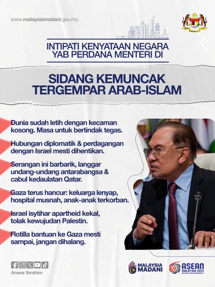 Perdana Menteri menegaskan demikian bagi membawa Kenyataan Negara terhadap isu Israel- Palestin ketika menghadiri Sidang Kemuncak Tergempar Arab-Islam, di Doha pada Selasa, 15 September 2025.