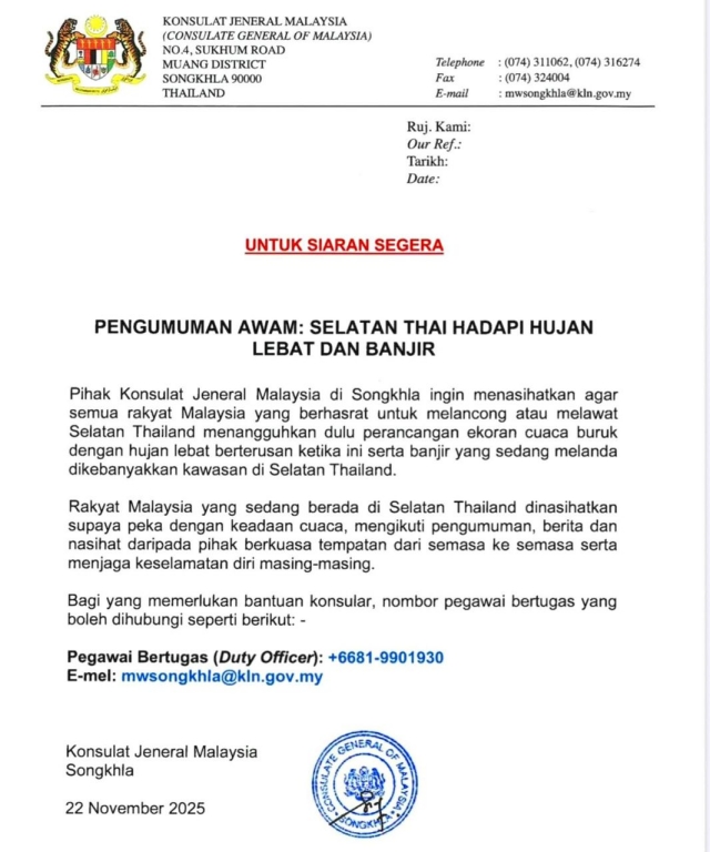 Menurut kenyataan rasmi yang dikeluarkan pada 22 November 2025, kawasan selatan Thailand kini mengalami hujan lebat berterusan yang menyebabkan berlaku banjir di banyak lokasi, sekali gus menimbulkan risiko keselamatan kepada pelawat.