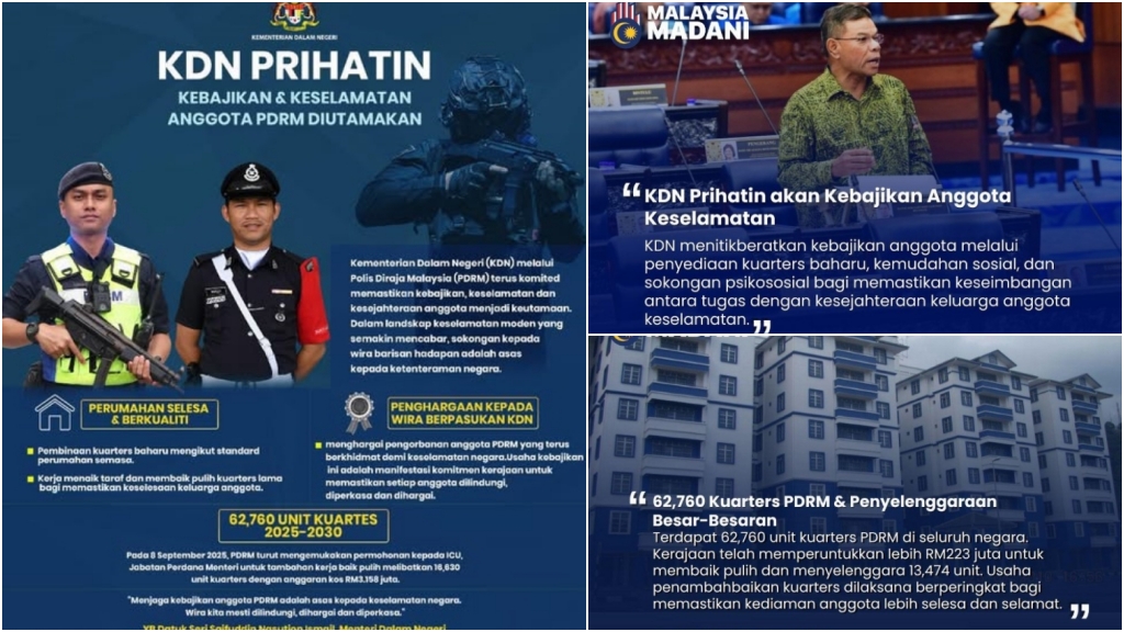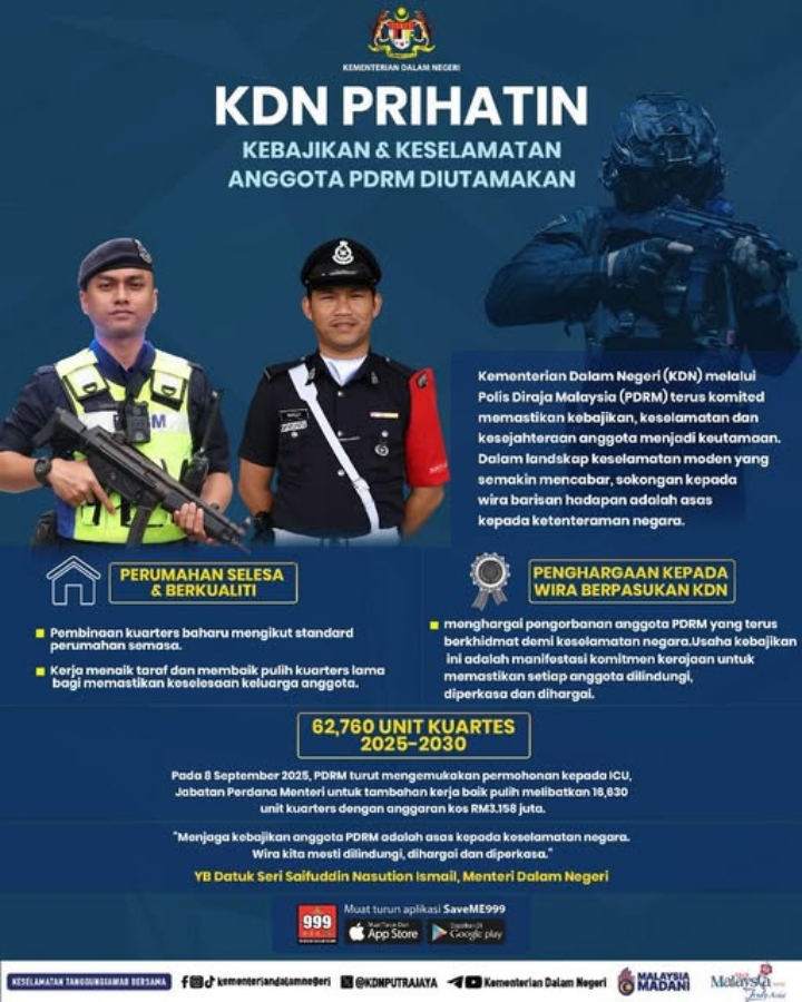 Manakala Menteri Dalam Negeri pula komited dalam memacu pembaharuan kebajikan PDRM untuk memperkukuh keselamatan nasional, meningkatkan standard kehidupan anggota, memberikan pengiktirafan sewajarnya kepada wira barisan hadapan dan memastikan keluarga anggota hidup lebih sejahtera dan selamat. - KitaReporters