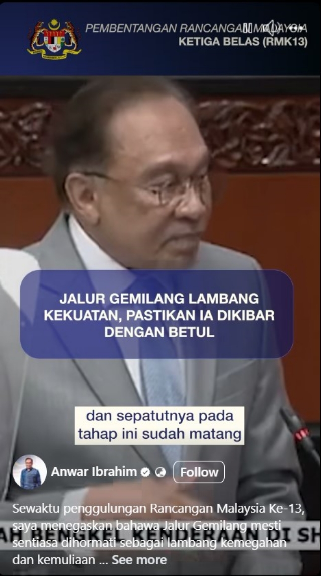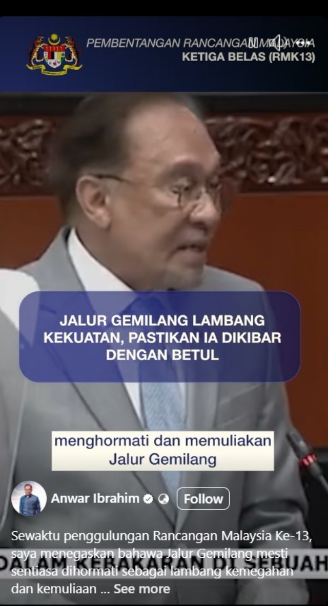 Perdana Menteri, Datuk Seri Anwar Ibrahim meminta semua pihak yang mahu mengibarkan bendera negara Malaysia, yakni Jalur Gemilang, agar mengibarkannya dengan betul dan mengikut peraturan.