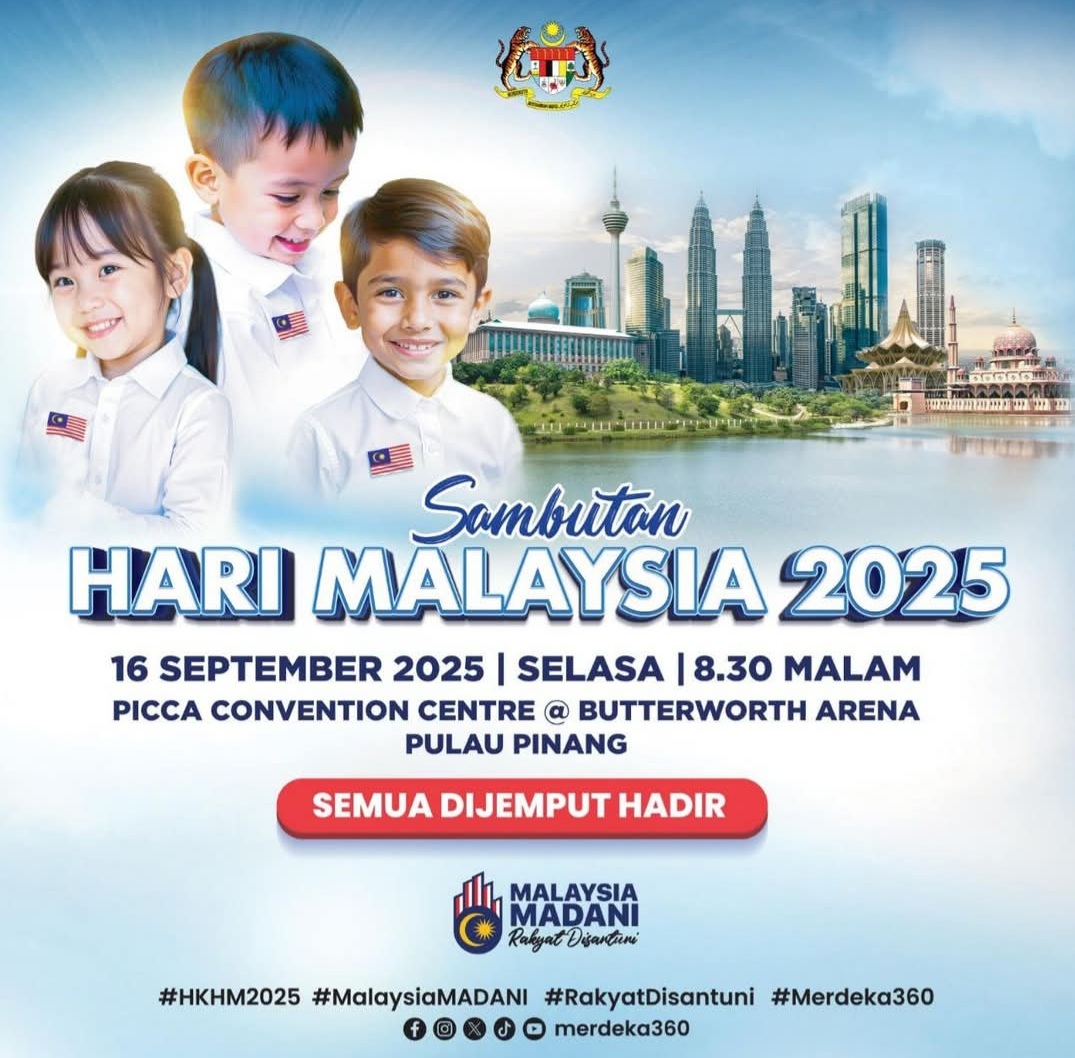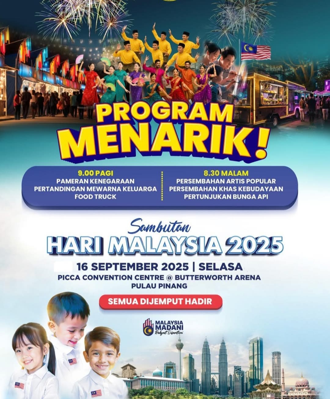 Ayuh ramai-ramai! Jom pi PICCA Convention Centre, Butterworth Arena pada 16 September sambut Hari Malaysia.