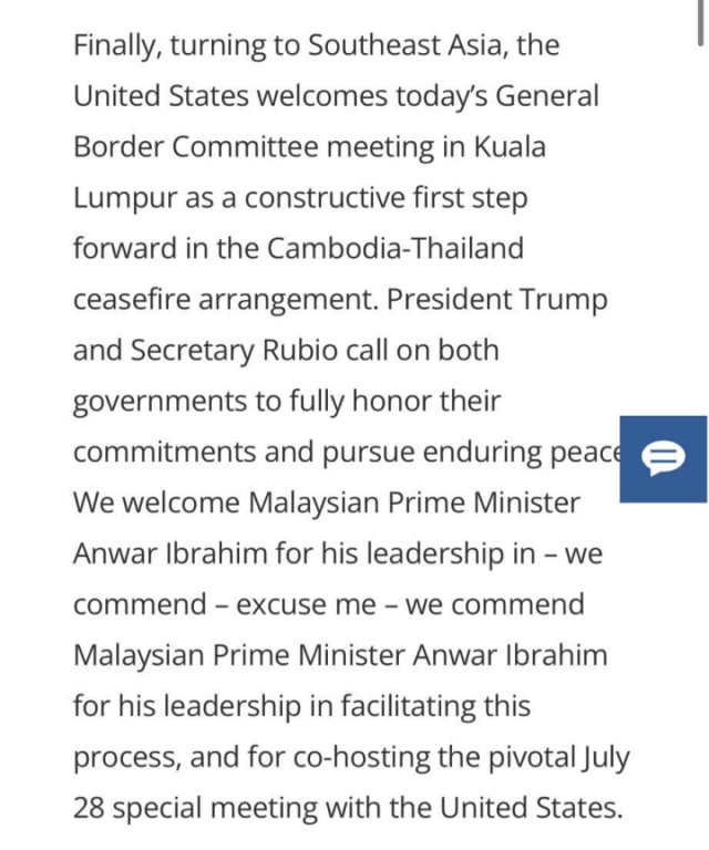 "Maaf... Kami memuji Perdana Menteri Malaysia Anwar Ibrahim atas kepimpinan beliau dalam memudahkan proses (gencatan senjata) ini, dan kerana menjadi tuan bersama mesyuarat khas penting pada 28 Julai 2025 lalu dengan Amerika Syarikat," kata Timbalan Jurucakap Jabatan Negara AS, Tommy Pigott pada taklimat media di Washington DC pada 7 Ogos 2025.