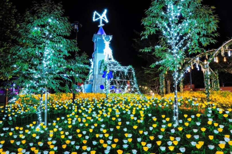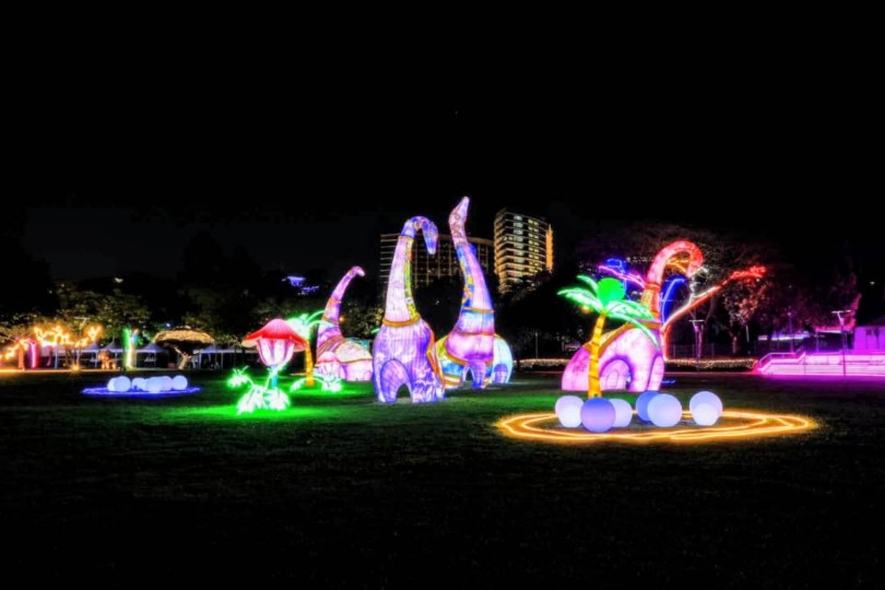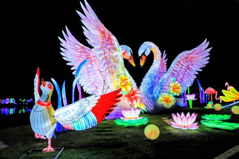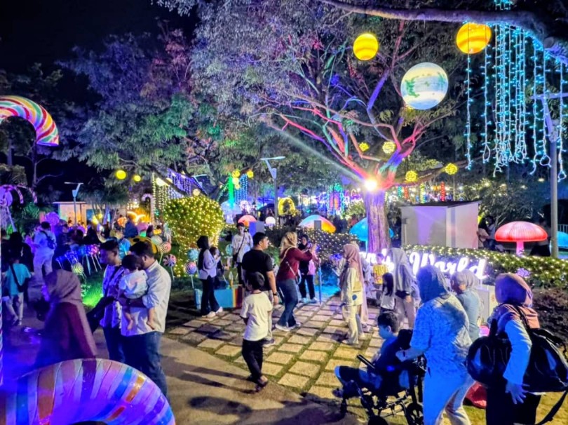 Taman yang dilimpahi cahaya lampu berwarna warni di Festival LENTERA 2025.