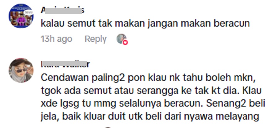 “Kalau nak tahu selamat atau tidak, tengok ada semut ke tidak. Kalau tiada langsung tu,selalunya beracun. Senang beli je daripada nyawa melayang,” tulis seorang netizen.