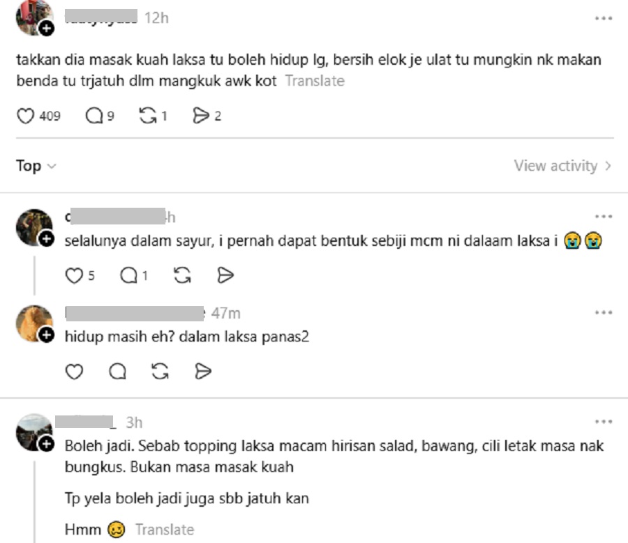 Perkongsian pertama dimuat naik oleh seorang pengguna dikenali sebagai @urfvrnaa._ yang meluahkan rasa terkejut apabila mendakwa menemui ulat hidup di dalam semangkuk laksa yang dibelinya.