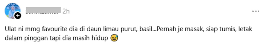 “Ulat ni memang kegemaran ia di daun limau purut, basil. Pernah je masak, siap tumis, letak dalam pinggan tapi dia masih hidup,” ceritanya.