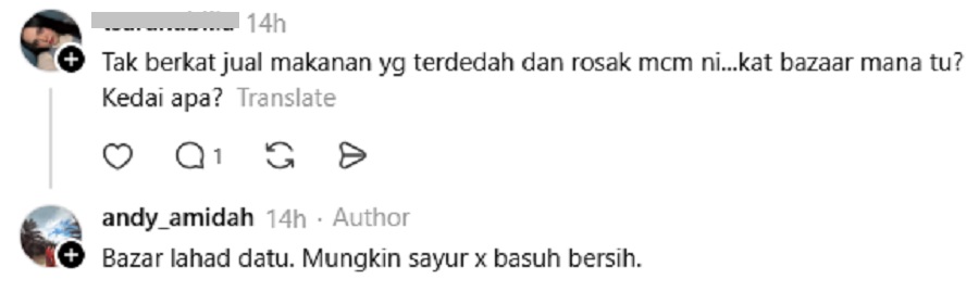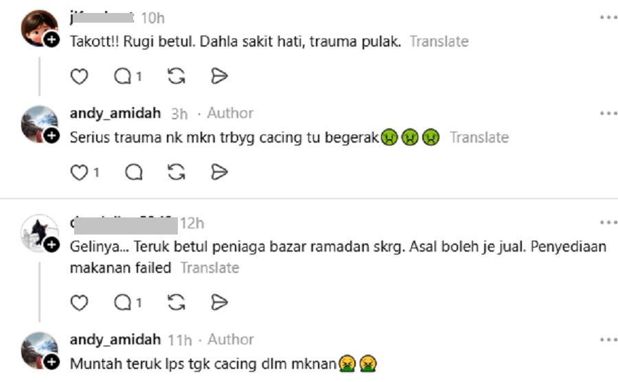 “Memang kali terakhirlah membeli di bazar. Ini bukan ulat, cacing terus, hidup pula tu,” tulisnya.