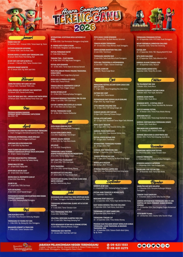 Lebih daripada 100 penganjuran acara dijadualkan untuk berlangsung bagi merancakkan sektor pelancongan negeri Terengganu, sekali gus memberi tambah nilai bagi kempen Tahun Melawat Malaysia 2026 yang menjadi agenda nasional bermula pada tahun hadapan (2026).