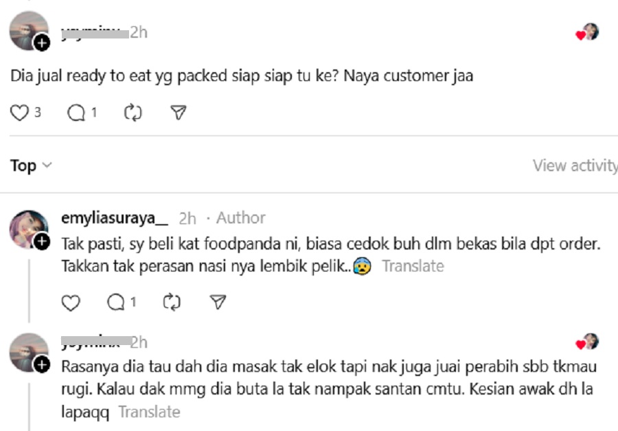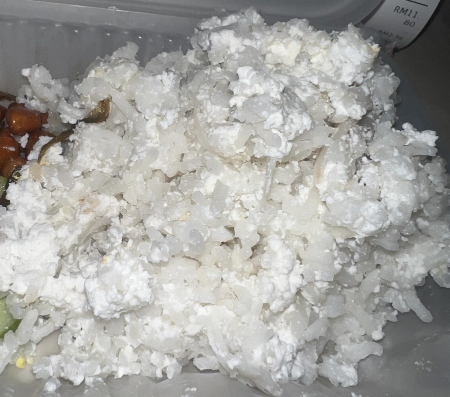 “Tak pasti, saya beli dalam Foodpanda ni, biasa cedok bubuh dalam bekas apabila dapat tempahan. Takkan tak perasan nasinya lembik, pelik,” jawabnya kepada netizen yang bertanya.