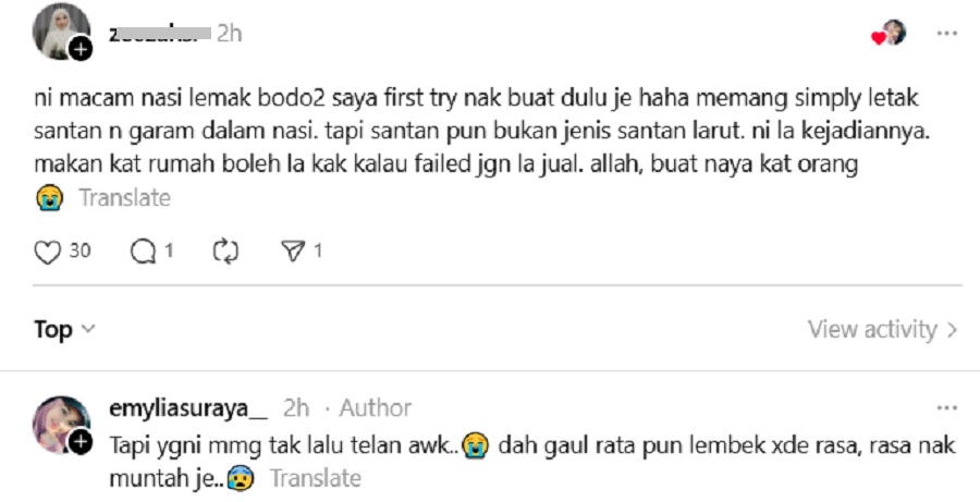 “Ni macam nasi lemak bodoh-bodoh saya first try nak buat dulu je haha. Makan kat rumah bolehlah kak, kalau sudah gagal janganlah jual. Allah, buat naya kat orang,” tulis salah seorang netizen.