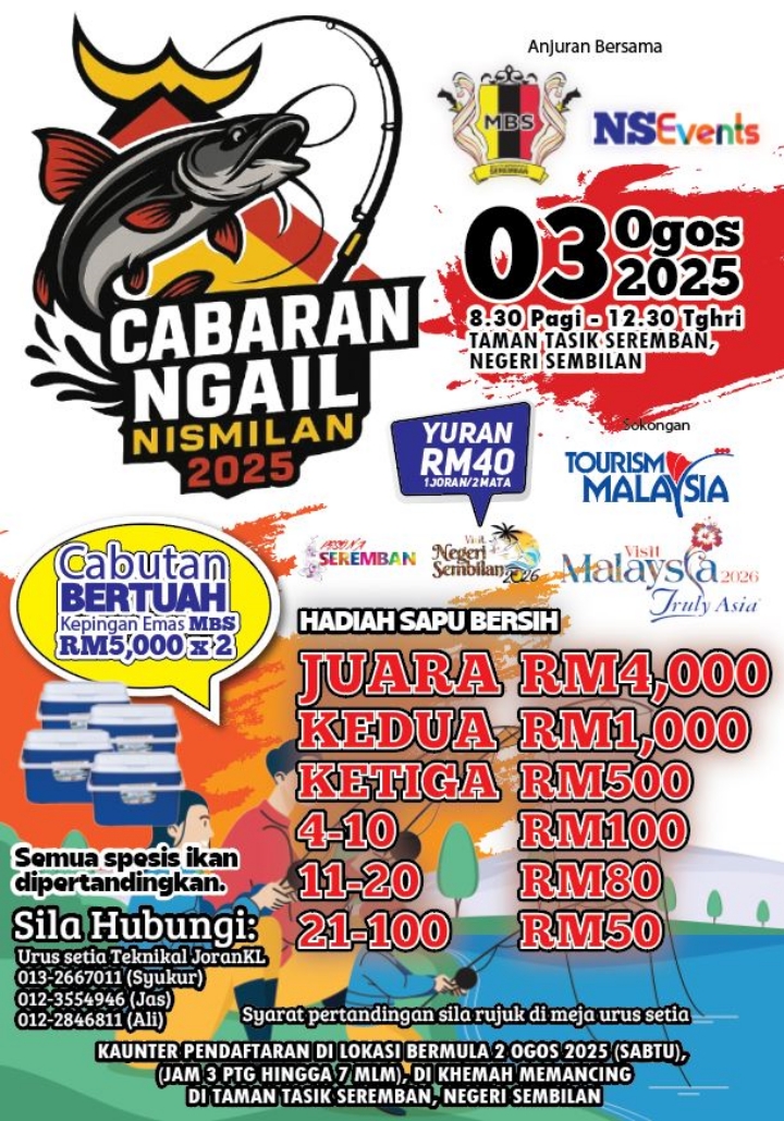Taman Tasik Seremban bakal kembali meriah apabila Cabaran Ngail Nismilan 2025 menghimpunkan ratusan kaki pancing dari seluruh negara pada Ahad ini, 3 Ogos 2025.