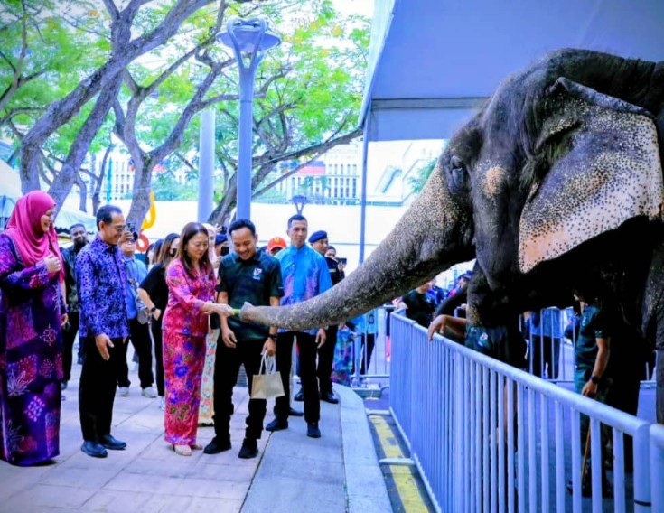 Hannah Yeoh memberanikan diri memberi pisang kepada gajah yang didatangkan khas oleh Jabatan Perhilitan dari Pusat Konservasi Gajah Kebangsaan Kuala Gandah, Pahang.