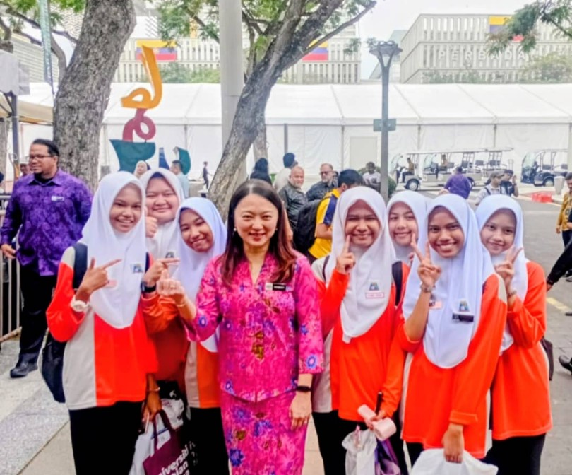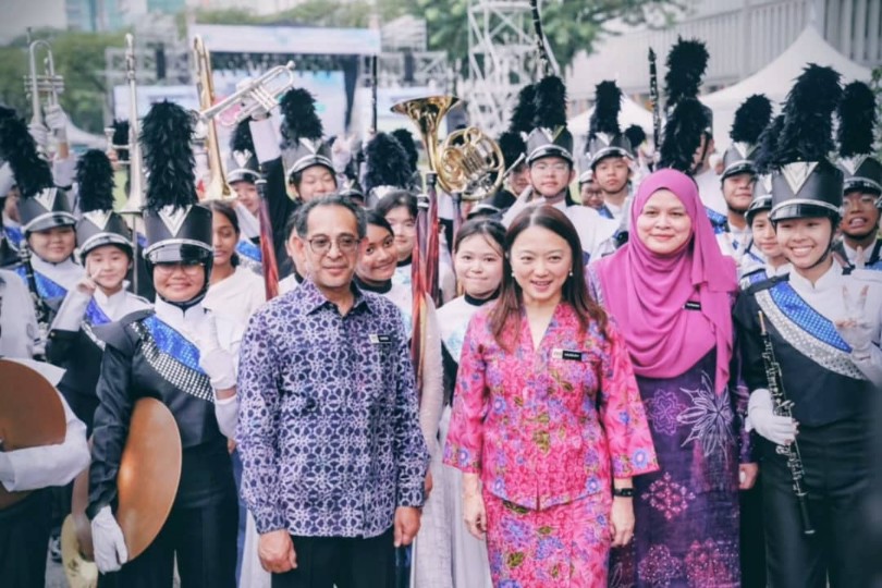 Hannah Yeoh, Noridah Abdulrahim dan Mohd Sakeri Abdul Kadir bergambar dengan salah pasukan sekolah yang mengambil bahagian dalam pertandingan pancaragam sempena Hari Terbuka Putrajaya 2026.