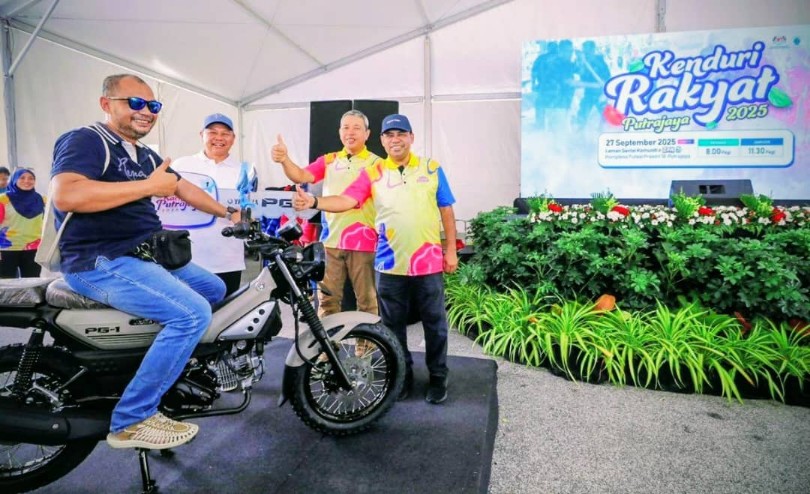 Amir Sarifudin Hashim seorang anggota komuniti Putrajaya dari Presint 9, menunjukkan tanda suka selepas menerima hadiah utama cabutan bertuah, sebuah motosikal Yamaha berharga kira-kira RM6,800.